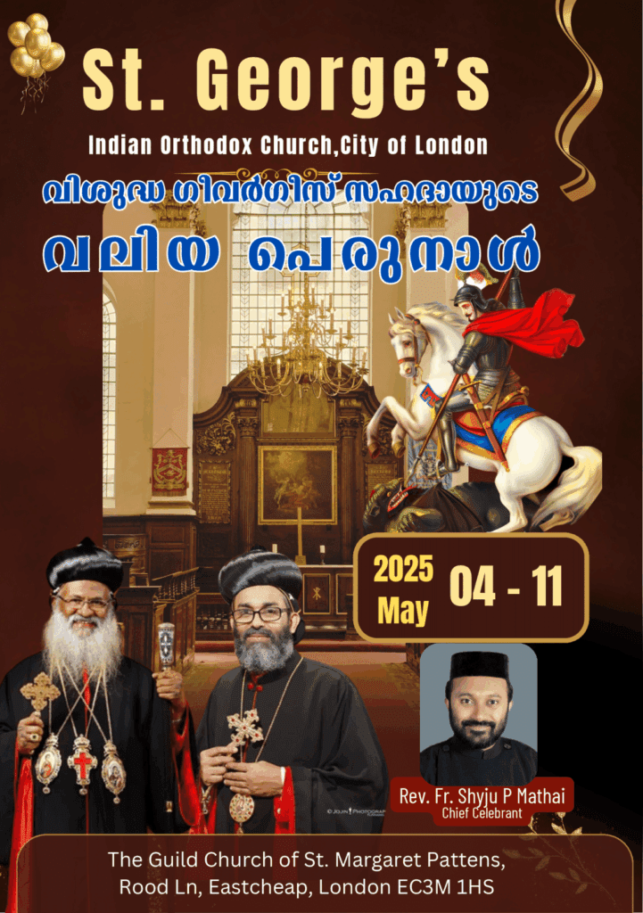 ഇടവക പെരുനാൾ 2024 – FEAST OF ST GEORGE May 4 – 12, 2024 May 4 – 12, 2024 ഇടവക പെരുനാൾ – FEAST OF ST GEORGE St George’s Indian Orthodox Church,